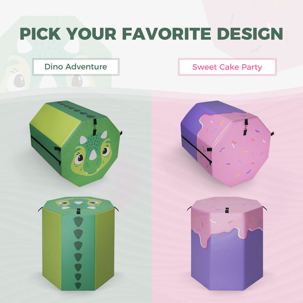The Cake and Dino themes are designed to motivate kids to stay active and engaged. Fun, colorful patterns help encourage movement, confidence, and imaginative play during practice.